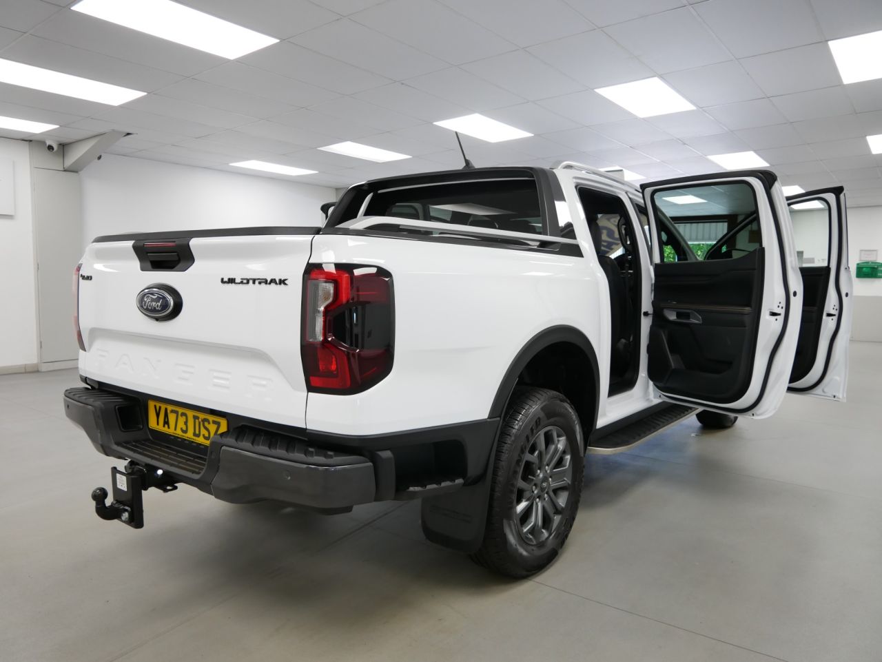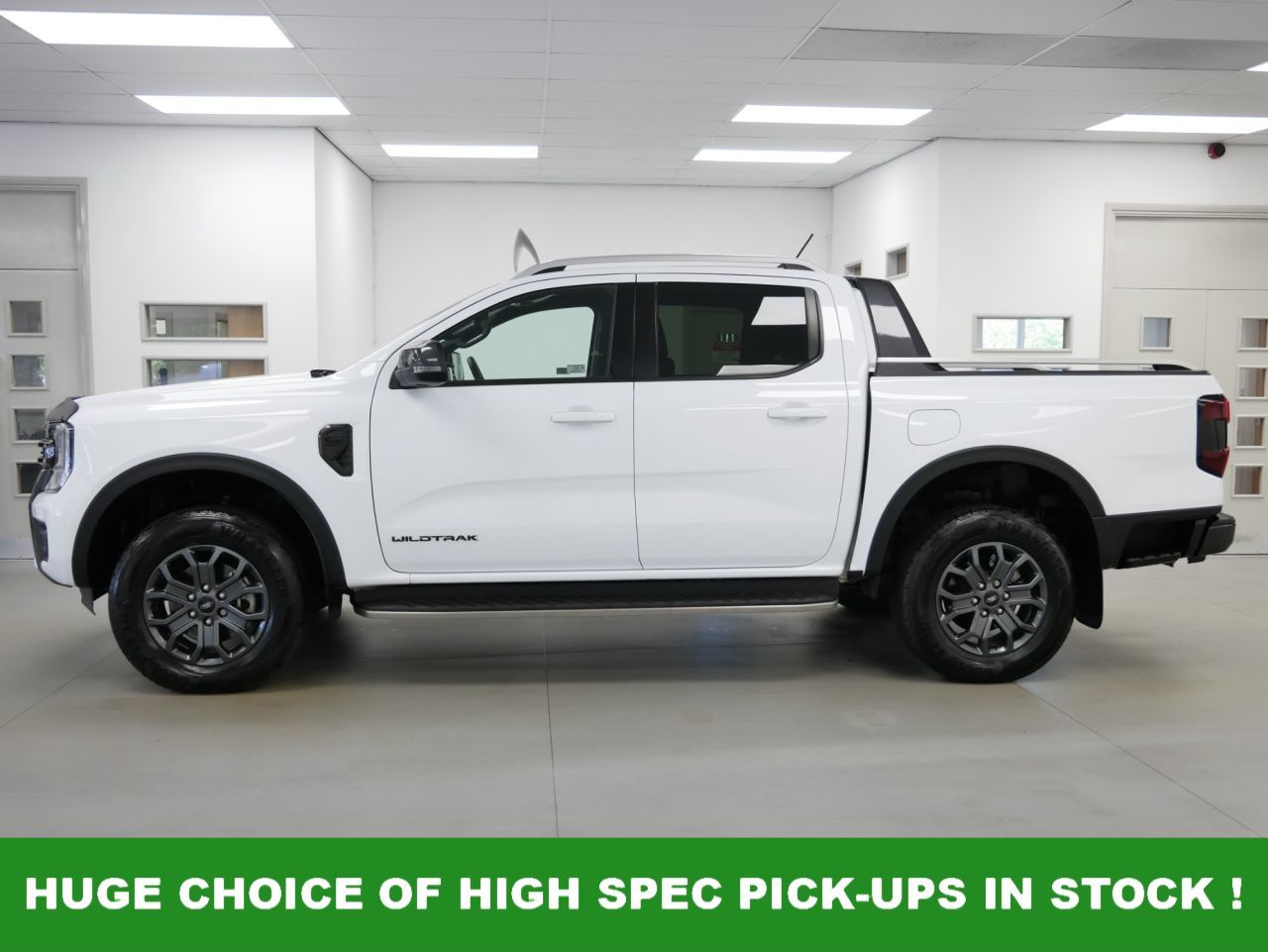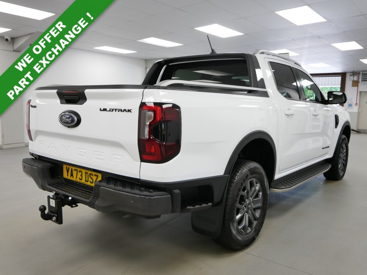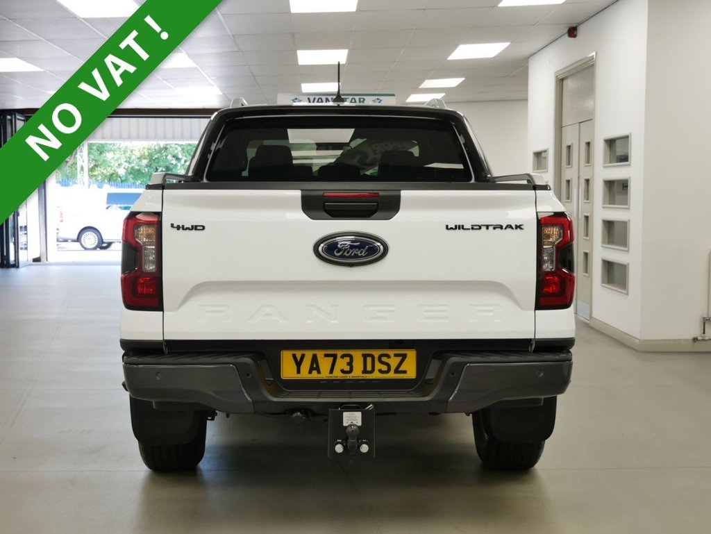 NO VAT ! . 73 PLATE Ford Ranger 2.0 TD 205 BHP EcoBlue Wildtrak 4WD Automatic Crewcab Pickup . High Spec No VAT Example in Frozen White with Air Con , Alloys , FACTORY SAT NAV MEDIA , FULL BLACK LEATHER INTERIOR , AUTOMATIC GEARBOX , FOUR WHEEL DRIVE , ELECTRIC ROLLER SHUTTER , Heated Seats , Electric Windows + Mirrors , Power Folding Mirrors , Privacy Glass , Limiter + Cruise Control , Bluetooth , DAB Radio , CarPlay Media , Reverse Camera , Park Sensors , Roof Rails , Tow Pack , Load Liner , Plus all usual styling and refinements found in the Higher Spec Wildtrak Edition models . Euro 6 Compliant . 2 Owners , Just 5000 Miles ! Best of all , No VAT To Pay !