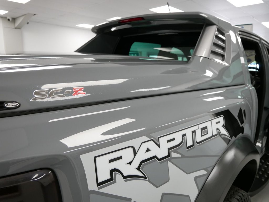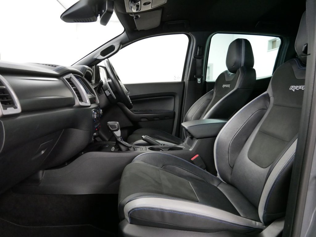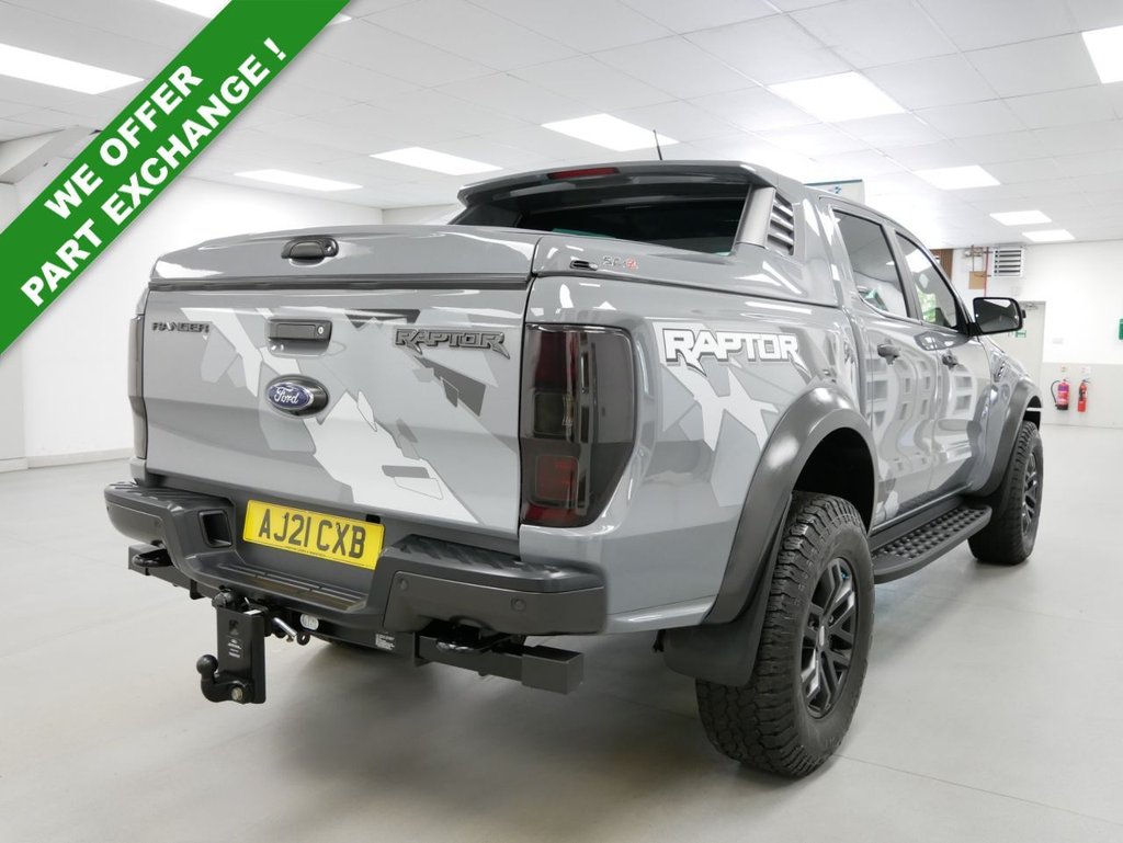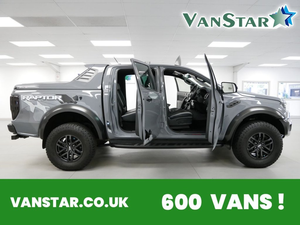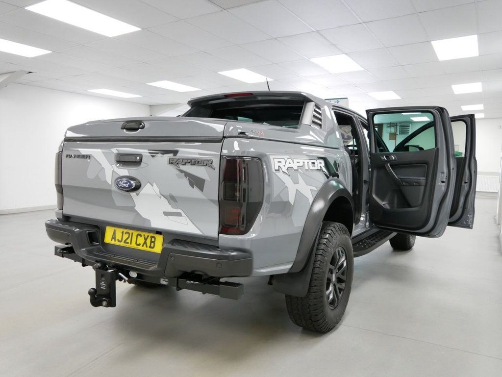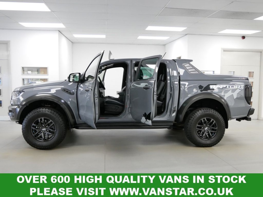 NO VAT ! . 2021 Plate Ford Ranger 2.0 EcoBlue 213 BHP Raptor Edition 4WD Automatic Crewcab Pickup . High Spec No VAT Example in Conquer Grey with Air Con , Black Alloys , FACTORY SAT NAV MEDIA , SC-Z SPORTBACK LIFT COVER , RAPTOR DECAL DESIGN PACK , FULL BACK LEATHER INTERIOR WITH GREY INSERTS , AUTOMATIC GEARBOX , FOUR WHEEL DRIVE , Heated Seats , Electric Windows + Mirrors , Power Folding Mirrors , Limiter + Cruise Control , Privacy Glass , Bluetooth , DAB Radio , Park Sensors , Reverse Camera , Side Steps , Tow Pack , Plus all usual styling and refinements found in the Higher Spec RAPTOR EDITION models . Euro 6 Compliant . Just 18000 Miles From New , Main Dealer Serviced ! Best of all , No VAT To Pay !