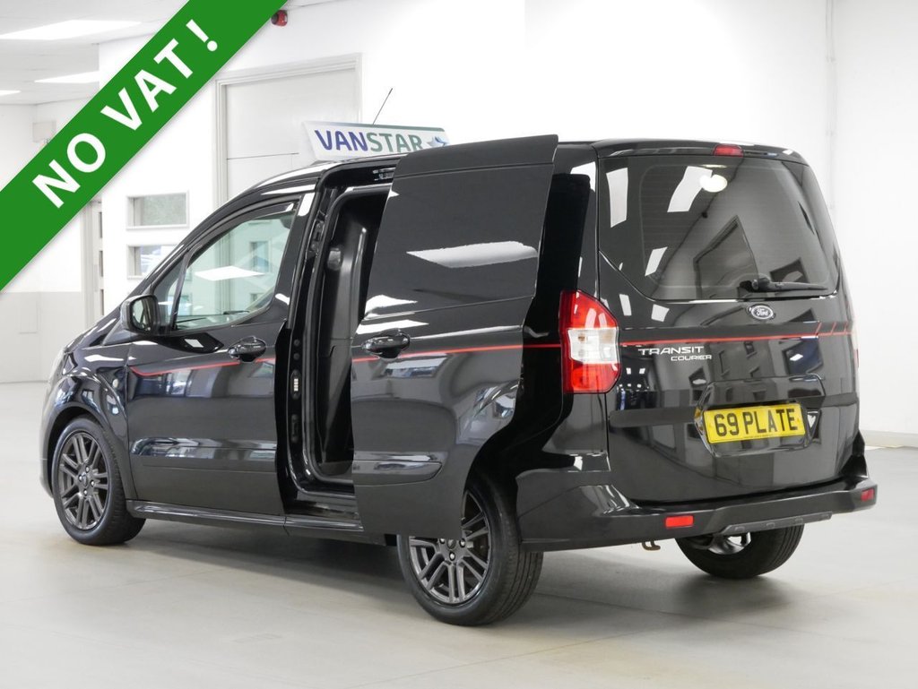 NO VAT ! . 69 Plate Ford Transit Courier 1.5 TDCi 100 BHP Sport Edition 4dr . High Spec NO VAT Example in Agate Black with Air Con , Black Alloys , RARE GLAZED TAILGATE MODEL , FACTORY SAT NAV MEDIA , 6 SPEED GEARBOX , Higher 100 Bhp Output Engine , Electric Windows + Mirrors , Remote Central Locking , Heated Front Screen , Front Fog Lights , Bluetooth , Cargo Lining , Bulkhead , Sport Decal Pack , Plus all usual styling and refinements found in the High Spec Sport Edition models . Euro 6 Compliant . 66000 Miles , Excellent History ( 6 x SERVICES ! ) . Great Spec , Best of all , No VAT To Pay !