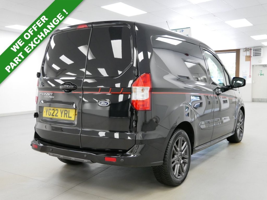 NO VAT ! .. 2022 Plate Ford Transit Courier 1.0 EcoBoost 100 BHP Sport Edition 5dr .. High Spec No VAT Example in Metallic Black with Air Con , Alloys , FACTORY SAT NAV MEDIA , SPORT EDITION DECAL DESIGN PACK , HALF LEATHER SPORT DESIGN INTERIOR , Electric Windows + Mirrors , Power Folding Mirrors , Bluetooth , Cruise Control , Park Sensors , Cargo Lining , Bulkhead , Plus all usual styling and refinements found in the High Spec Sport Edition models .. Euro 6 Compliant .. Only 2 Owners , Just 48000 Miles , 4 x Services ! Best of all , No VAT To Pay !