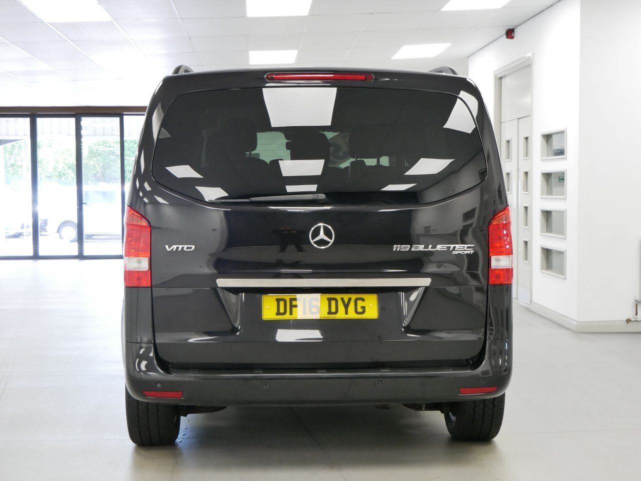 2016 Plate Mercedes-Benz Vito Rwd 119 2.1 CDI 190 BHP SWB Sport Edition 7G Automatic 5DR CrewCab 5 Seater. High Spec Example in Obsidian Black with Air Con , Alloys , FACTORY SAT NAV , GLAZED TWIN SIDE ACCESS DOORS + TAILGATE , 7G AUTOMATIC GEARBOX , Electric Windows + Mirrors , Power Folding Mirrors , Privacy , Remote Central Locking , Bluetooth , Cruise Control , Factory Front + Rear Parking Sensors , Roof Rails , Side Bars , Cargo Lining , Plus all usual styling and refinements found in the High Spec Sport Edition models . ONLY 2 OWNERS FROM NEW , JUST 60000 MILES , Excellent History ( 3 x MAIN DEALER SERVICES ) . Great Spec , Physical Stock !