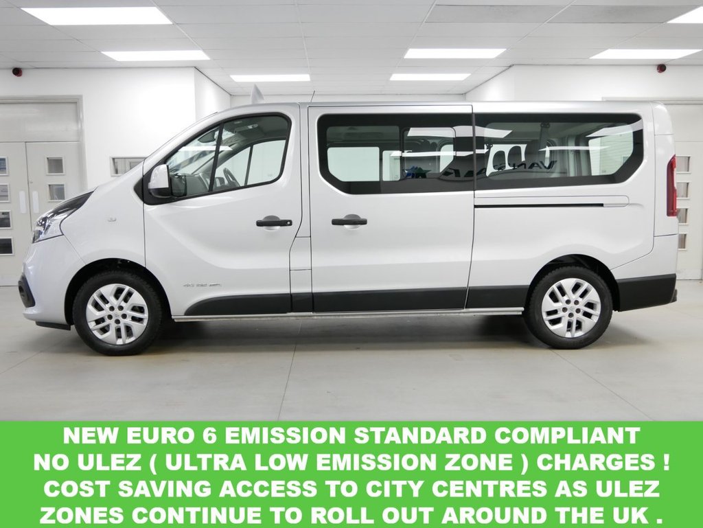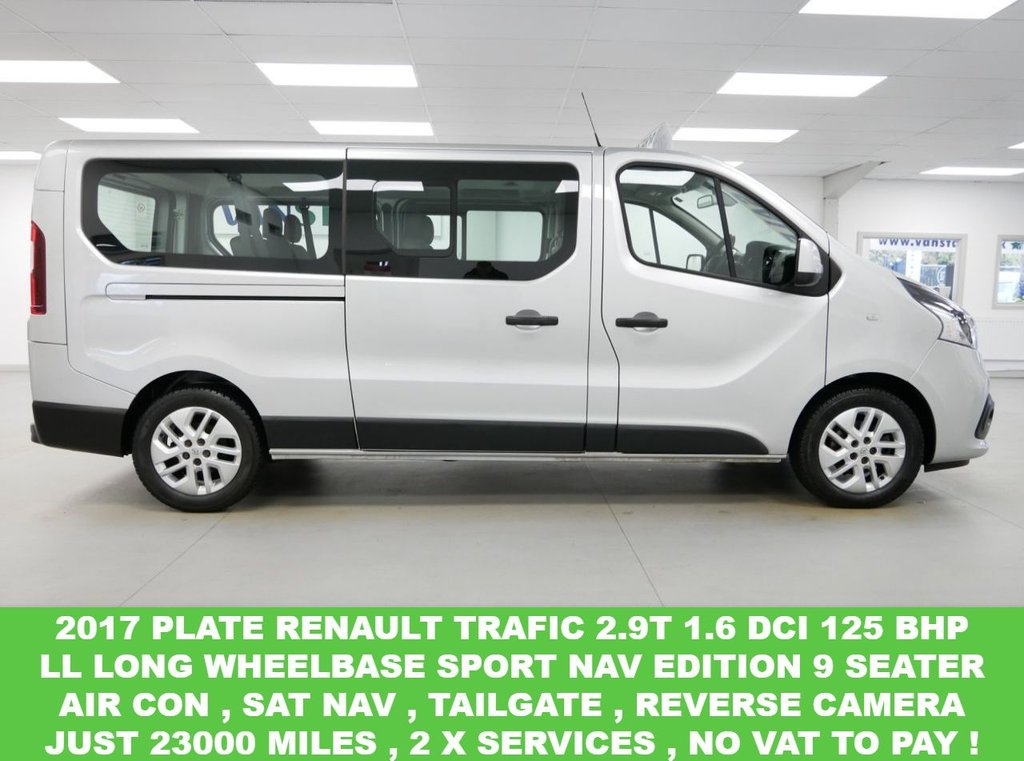 NO VAT ! . 2017 PLATE RENAULT TRAFIC 2.9T 1.6 DCI 125 BHP LL LONG WHEELBASE SPORT NAV EDITION 9 SEATER . HIGH SPEC NO VAT EXAMPLE in Metallic Silver with Air Con , Alloys , SAT NAV MEDIA , LL LONG WHEELBASE , 9 SEATS , TWIN SIDE ACCESS DOORS + TAILGATE , Electric Windows + Mirrors , Privacy , Bluetooth , Cruise Control , Park Sensors , Plus all usual styling and refinements found in the HIGH SPEC SPORT NAV EDITION models . EURO 6 COMPLIANT . JUST 23000 MILES FROM NEW , 2 x SERVICE STAMPS ! Best of all , NO VAT TO PAY !