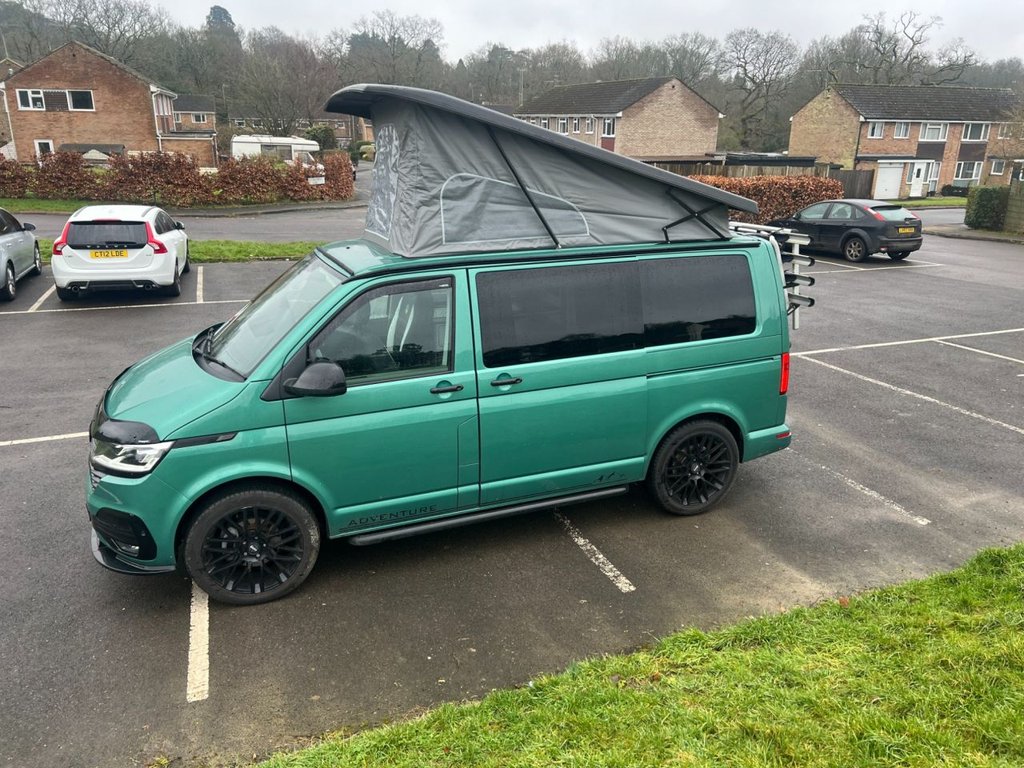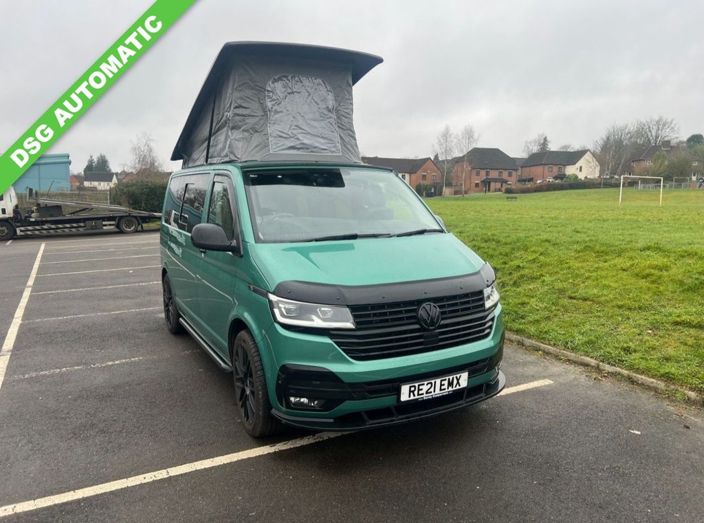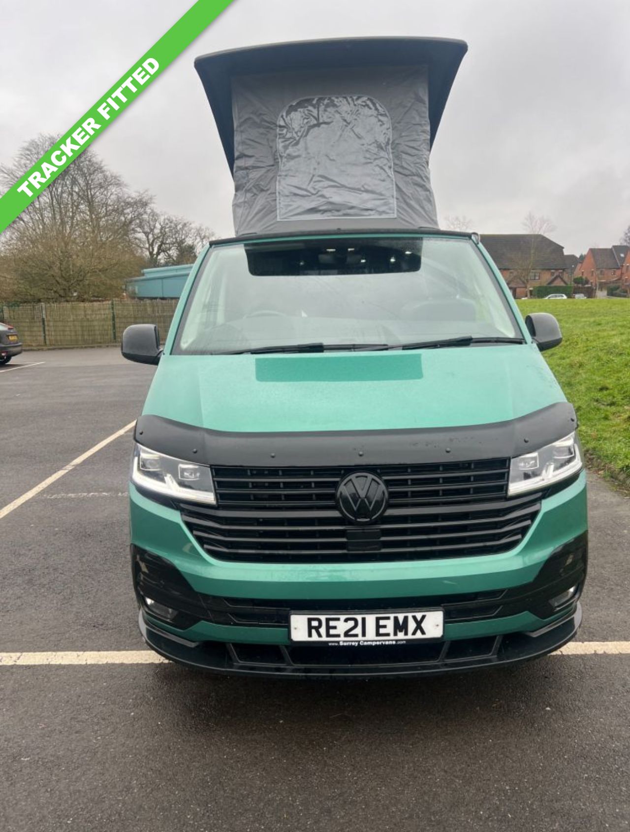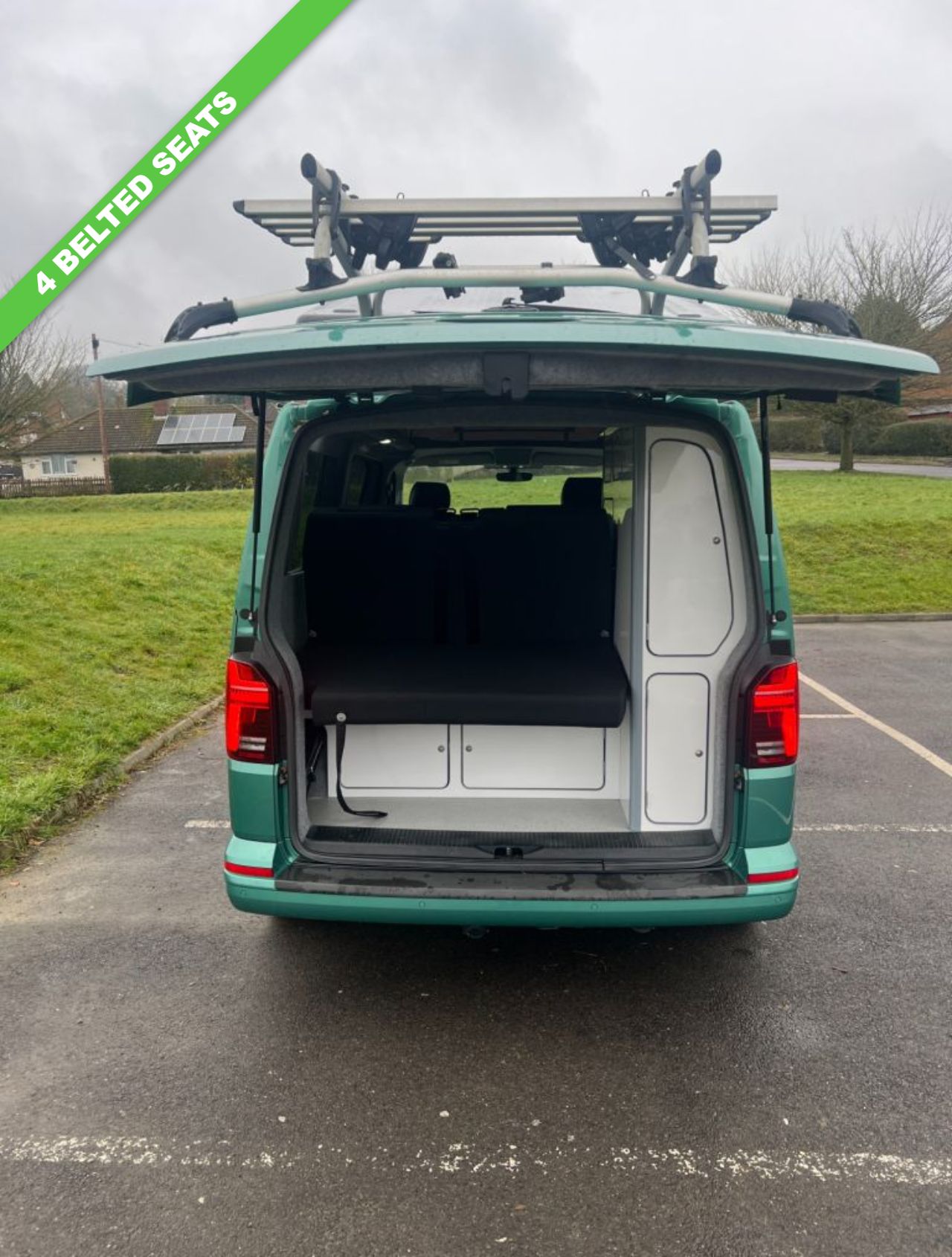 Stunning VW T6-1 Campervan, 2021,4 Berth 4 Belted seats, DSG Automatic 2 litre, 29,579 miles. Motorhome World Southwest would like to present this Stunning Green well equipped upgraded T6-1 VW Campervan, TDi T28 professionally converted by Surrey Campervans from new in 2021, with the addition of a fitted Panoramic Pop Top, 4 berth, Captains chairs (1 Front seat swivels) with 4 belted seats, and very good service history. > RIB BED • Cab Air Con Tailgate • Captains Swivel front seat, leather embossed with VW Logo • 2 Further rear belted seats • 19" Black Alloys • Full internal lighting • Table • Rib Bed • Pop Top • Autotherm Diesel Blown Heating • External Front Window Screen • 4 bike rack • Reversing Sensors • Ample, rear and under bed storage • Gas Hob • Fridge with Cold Box • Cup Holders • Radio/CD Player • Good Service History • 4 Berth, Pop Top with foam Mattress • 240 pop up sockets • USB Sockets • Smart Track Tracker • Leisure Battery with Solar panel • Calor Gas Bottle • Spare Wheel • External Fixed awning rail This vehicle will come with a full HPI check and will be issued with a NCC Habitation Check and 3 YEARS Warranty